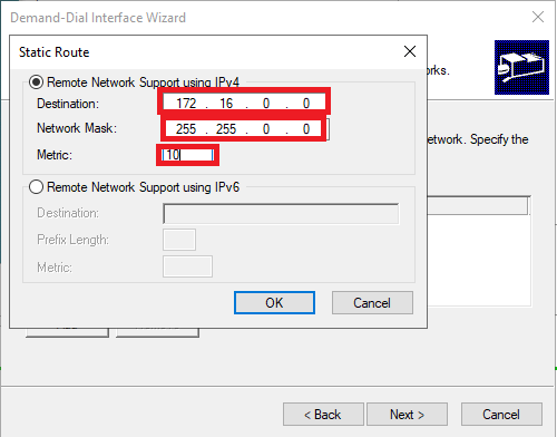 Step 12: On the Static Routes for Remote Networks page we will be adding the IP address space from the virtual network we created on Azure mine was 172.16.0.0/16. Click on the Add button and then type in the IP address. I will use 10 for the Metric and then click ok. The metric is used to determine the priority of different routes to the same network, and the route with the lowest metric value is chosen as the preferred route.
