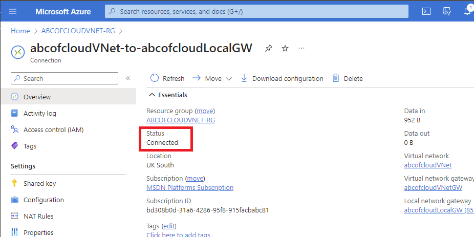 Now if I click on the connection that has been created, and take a look at the overview the status will be Unknown.